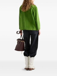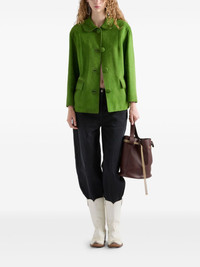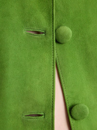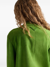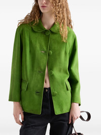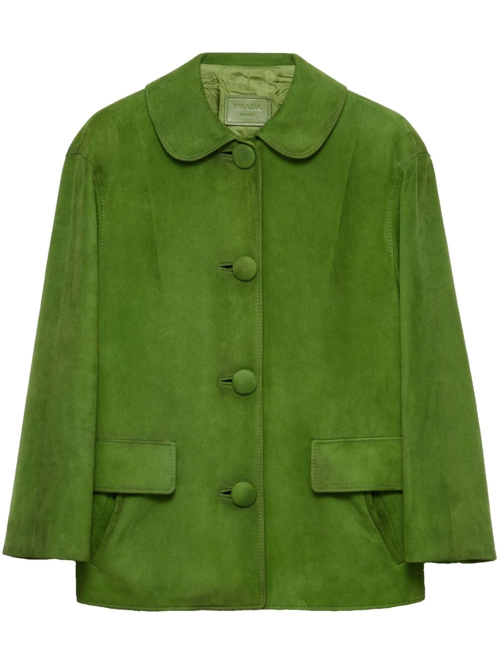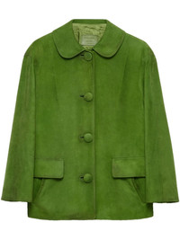 suede jacket Highlights - Apple green - Front button fastening - Peter pan collar - Two side flap pockets - Enamel triangle logo Composition Suede 100% Washing instructions Read Manufacturer Guidelines