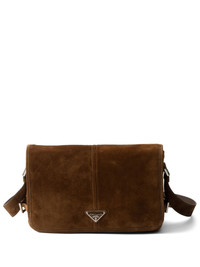 suede shoulder bag Highlights - Chocolate brown - Foldover top with magnetic fastening - Adjustable shoulder strap - Internal zip-fastening pocket - Enamel triangle logo Composition Outer: Calf Suede 100% SIZE & FIT Measurement DEPTH 4.33 in(11 cm) HEIGHT 7.87 in(20 cm) WIDTH 11.81 in(30 cm)