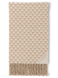 Symbole reversible wool-cashmere scarf This neutral-hued scarf is part of the Symbole collection – a modern reinterpretation Prada’s iconic triangle logo. The angular shapes of the jacquard pattern lend a fresh perspective to the heritage emblem. Highlights - Cream white/beige - Wool/cashmere - Knitted construction - Triangle jacquard - Logo jacquard - Fringed edge Composition Cashmere 100%, Wool 100% SIZE & FIT Measurement LENGTH 74.8 in(190 cm) WIDTH 11.02 in(28 cm) Washing instructions Read Manufacturer Guidelines