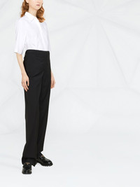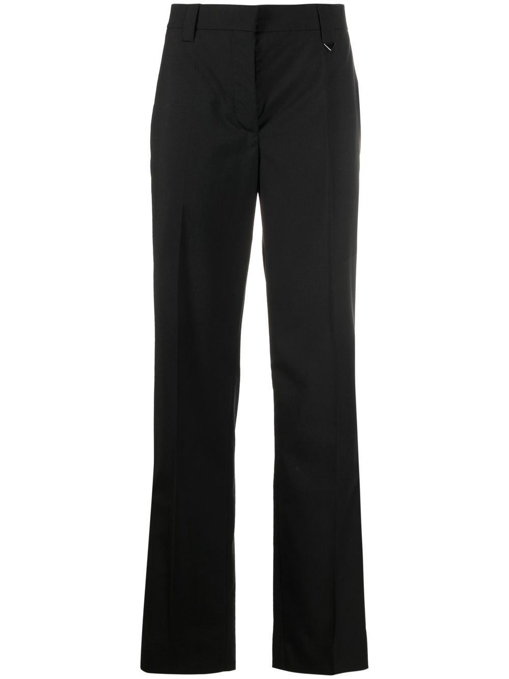 tailored logo-plaque trousers These Prada trousers boast a refined aesthetic thanks to the straight-leg tailored silhouette. This pair is finished with a subtle triangle logo, an iconic hallmark of the label. Composition Lining: Cotton 100%, Recycled Cupro 100% Outer: Virgin Wool 100% SIZE & FIT Model measurements Height 5 ft 10 in(1.78 m) Bust/Chest 31.49 in(80 cm) Hips 35.43 in(90 cm) Waist 24.4 in(62 cm) FittingInformation This piece fits true to size. We recommend you get your regular size Designed to be fitted at the waist and hips, loose over the leg Made with a mid-weight non-stretch fabric