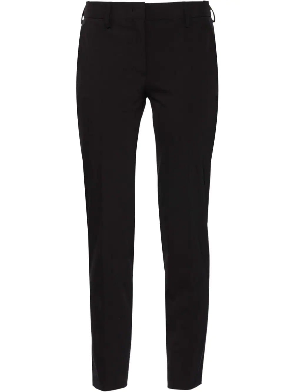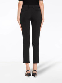 low-rise trousers Highlights - Since its founding in 1913, milanese fashion house prada has been rooted in the uncompromising pursuit of quality, style, class and innovation. these black technical fabric trousers from prada feature belt loops, a hook and zip fly, side slit pockets, rear welt pockets, a tailored design, a logo patch to the back and a slightly cropped length. Composition Polyester 89%, Spandex/Elastane 11%