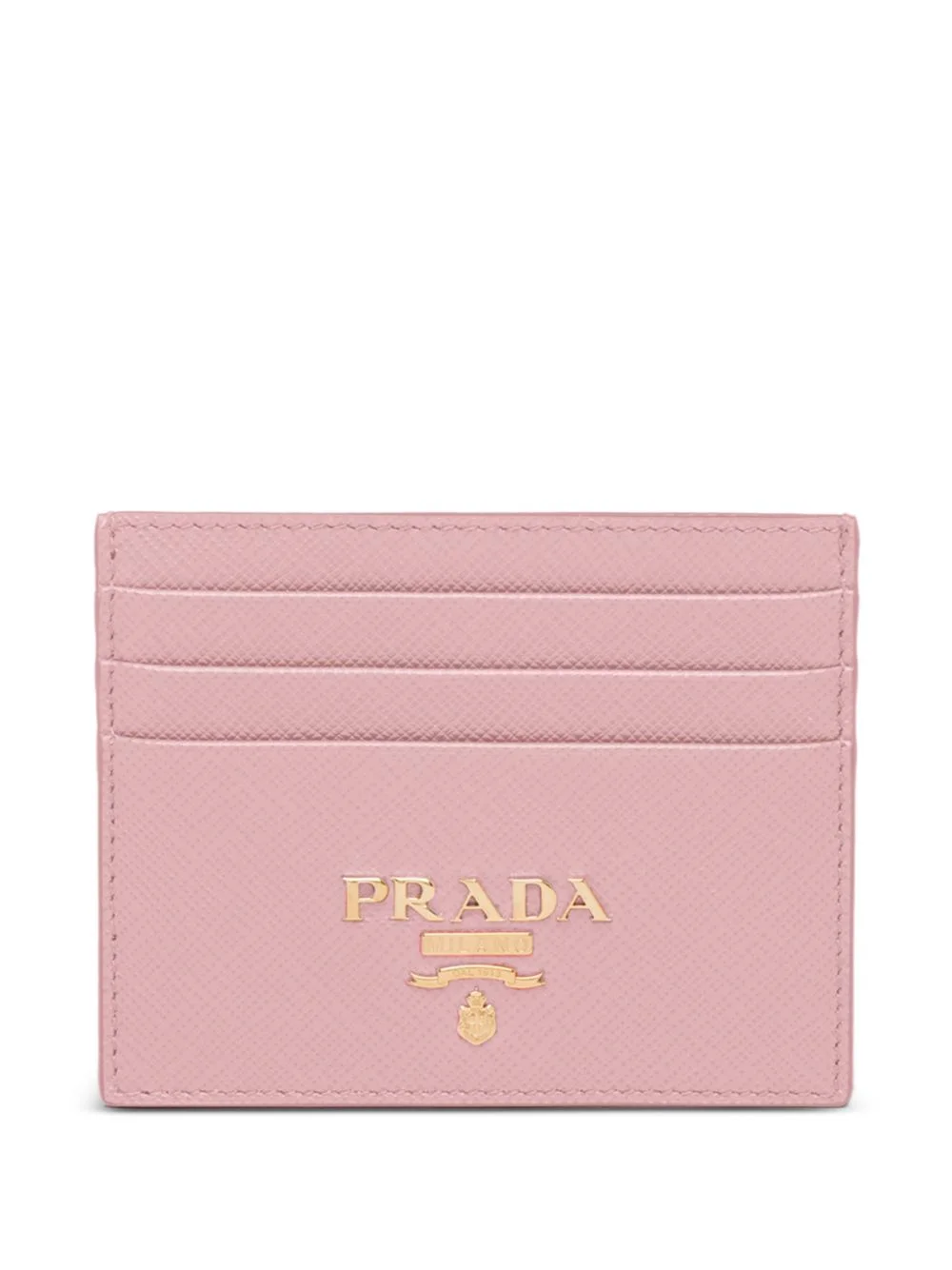 triangle-logo cardholder Born in 1913, Prada is known for its uncompromising quality and timeless design vision. Crafted from the brand's signature Saffiano leather, this cardholder is finished with gold-tone logo lettering to the front. Highlights - Pink - Triangle-logo - Card slots Composition Calf Leather 100% SIZE & FIT Measurement HEIGHT 3.14 in(8 cm) WIDTH 3.93 in(10 cm)