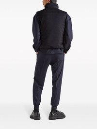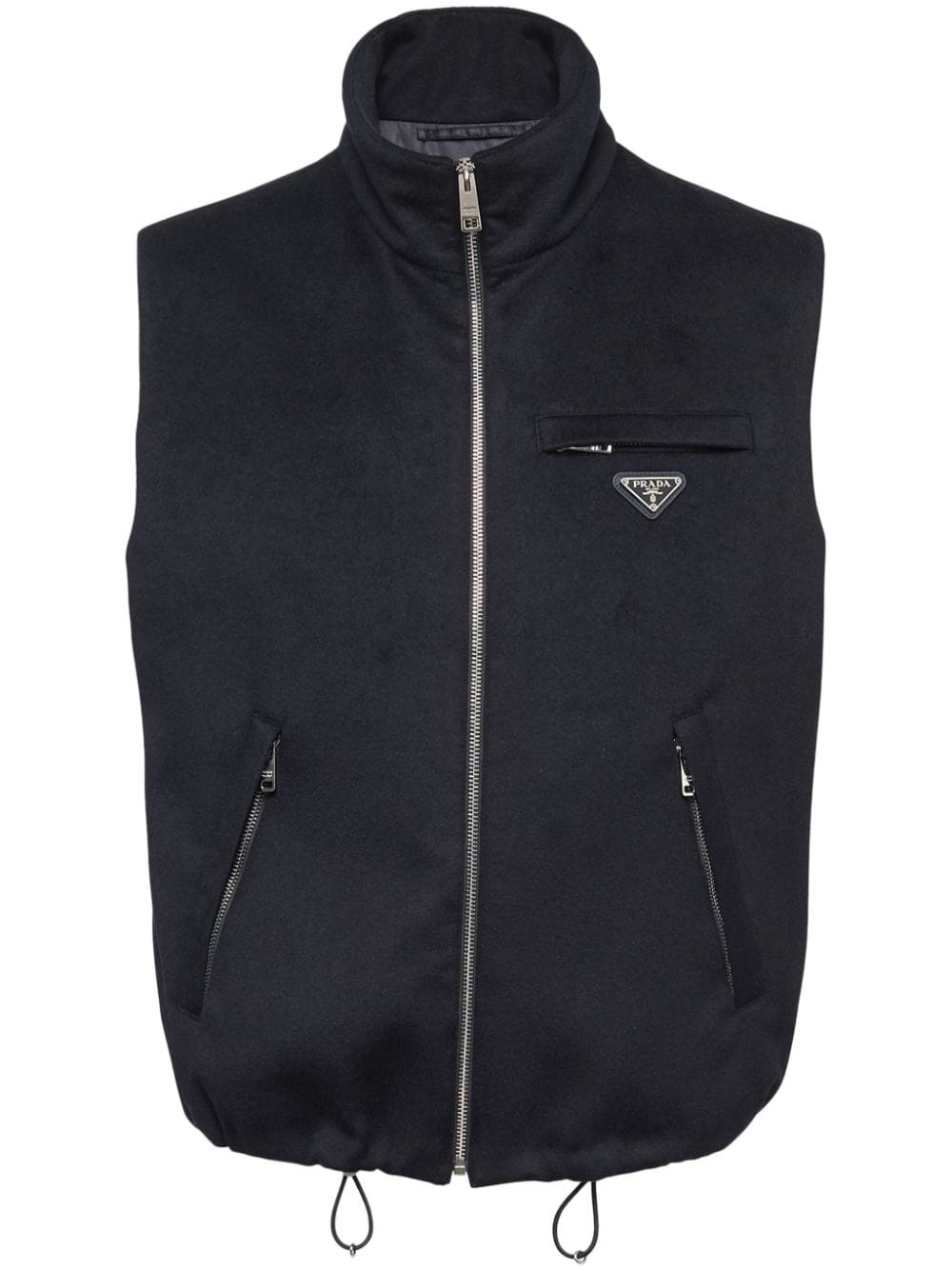 cashmere down vest Prada blends 'fine materials with the performance of technical outerwear' to create this midnight-blue gilet. Crafted from cashmere with a waterproof treatment, it boasts a sporty high-neck silhouette injected with goose down, lending warmth and protection. It is punctuated by silver-tone hardware and the maison's emblematic triangle logo at the chest. Highlights - Midnight blue - Cashmere - Goose down - Enamel triangle logo - Waterproof - Padded design - Taped seams - High neck - Front zip fastening - Sleeveless - Zip-fastening chest pocket - Two side zip-fastening pockets - Straight hem - Silk lining - Drawstring hem Composition Cashmere 100%, Polyurethane 100%