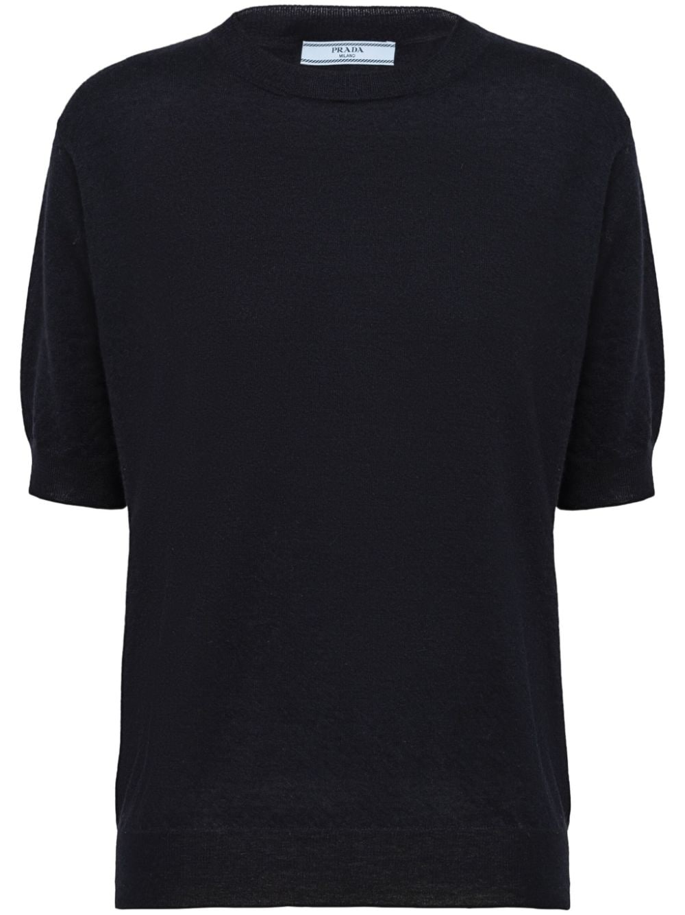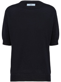 triangle-logo cashmere knitted top Combining distinctive details with a minimalist style, Prada presents this midnight-blue knitted top. Spun from soft cashmere, it is punctuated with the brand's triangle logo at the rear for a signature touch. Highlights - Midnight blue - Cashmere - Knitted construction - Triangle logo - Mini logo tag - Crew neck - Short sleeves - Ribbed cuffs and hem Composition Cashmere 100% Washing instructions Read Manufacturer Guidelines