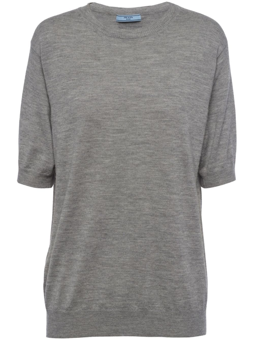 triangle-logo cashmere knitted top Highlights - Ash grey - Cashmere - Melange effect - Triangle logo - Applique logo - Crew neck - Short sleeves - Ribbed cuffs and hem Composition Cashmere 100% Washing instructions Read Manufacturer Guidelines