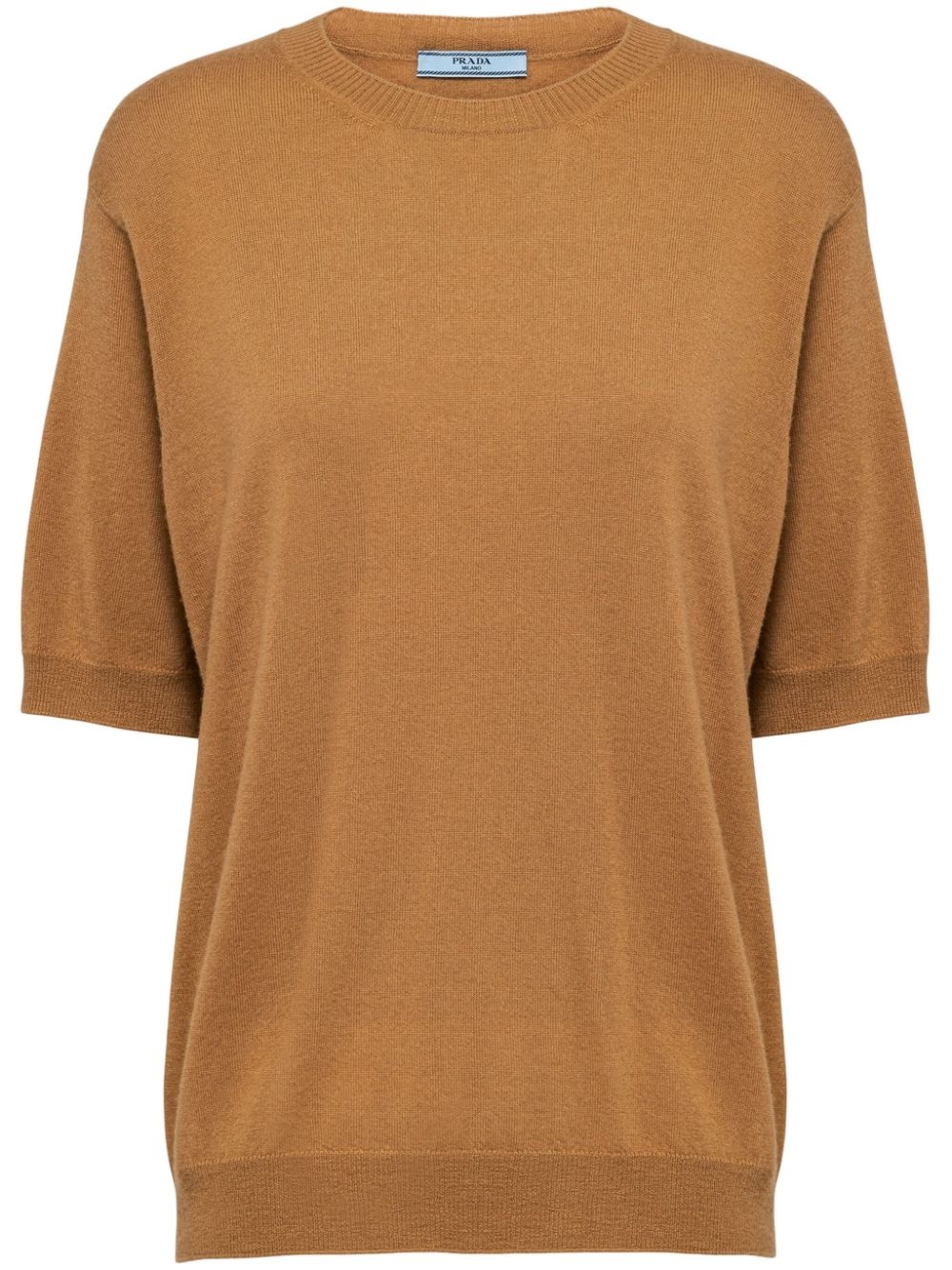 triangle-logo cashmere knitted top Combining distinctive details with a minimalist style, Prada presents this camel-brown knitted top. Spun from soft cashmere, it is punctuated with the brand's triangle logo at the rear for a signature touch. Highlights - Camel brown - Cashmere - Knitted construction - Triangle logo - Mini logo tag - Crew neck - Short sleeves - Ribbed cuffs and hem Composition Cashmere 100%