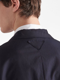 triangle logo cotton blazer This single-breasted blazer illustrates Prada's affinity for sartorial tailoring punctuated with modern details. Crafted in Italy from navy-hued cotton, its classical construction is detailed with the iconic triangle logo reimagined in a stripped-back, tonal fabric iteration. Composition Cotton 100%