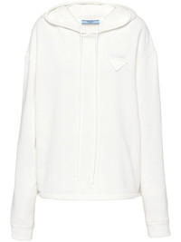 triangle-logo cotton hoodie This long-sleeve hoodie is adorned with Prada's triangle logo at the chest, granting it a distinctive, but still minimalistic look. Crafted from a white cotton jersey, it showcases the brand's innovative take on essentials. Highlights - White - Cotton - Triangle logo - Drawstring hood - Long sleeves Composition Cotton 100%