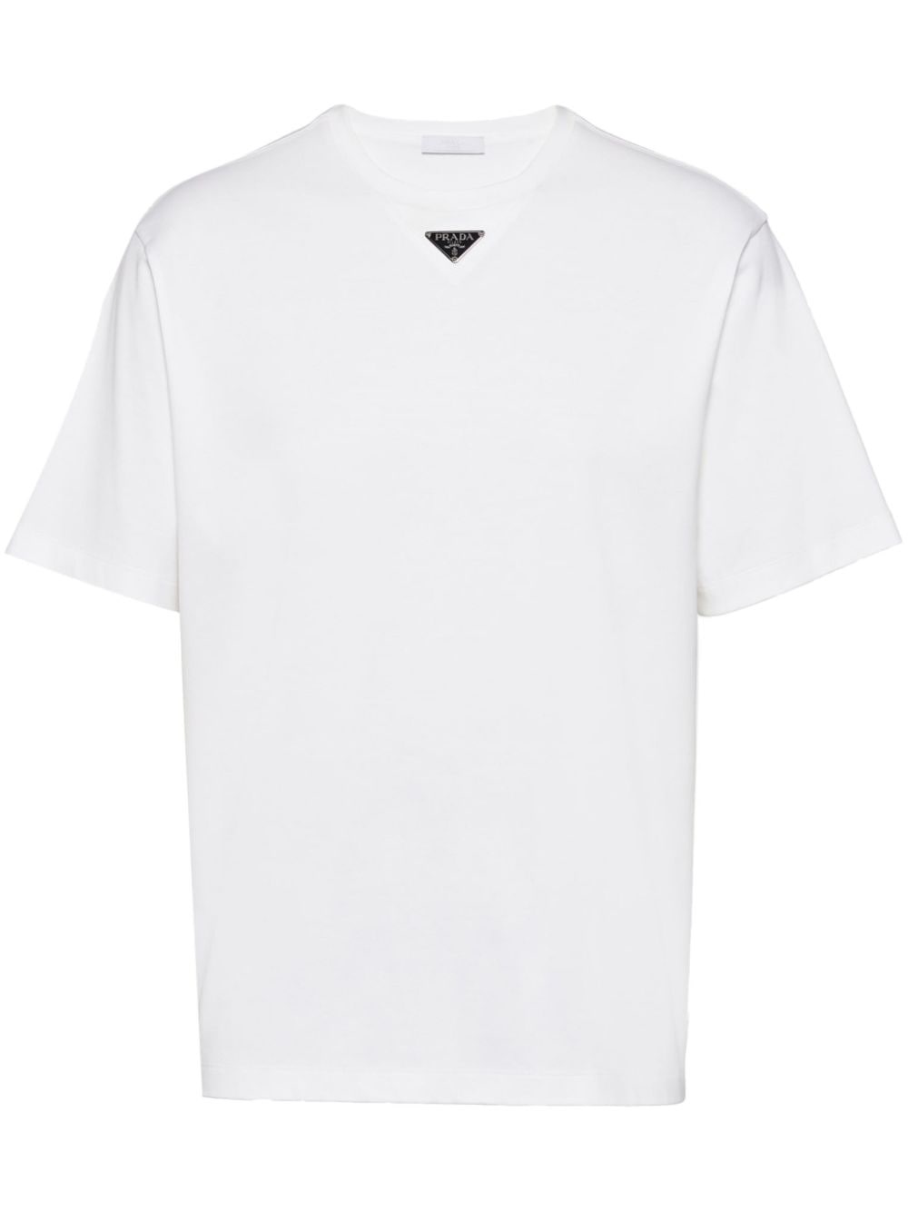 triangle-logo cotton T-shirt Prada's beloved triangle logo is featured across its collections, adding a signature touch even to the most casual pieces. This cotton T-shirt is a fine example, accented with the branded enamel plaque just below the crew neckline. Highlights - White - Cotton - Enamel triangle logo - Crew neck - Short sleeves - Straight hem Composition Cotton 100%