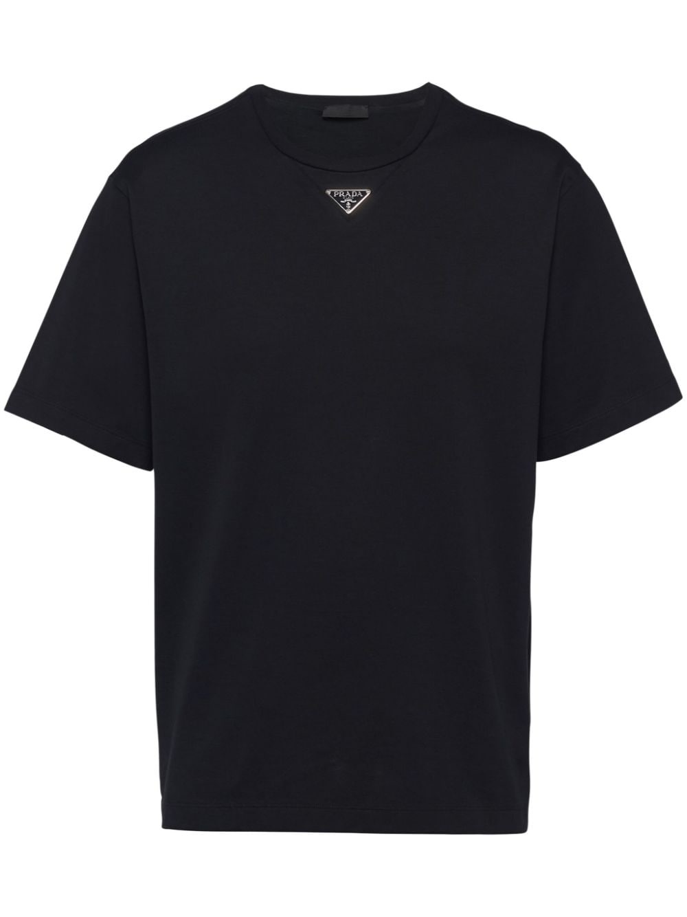 triangle-logo cotton T-shirt Prada's beloved triangle logo is featured across its collections, adding a signature touch even to the most casual pieces. This cotton T-shirt is a fine example, accented with the branded enamel plaque just below the crew neckline. Highlights - Black - Cotton - Jersey texture - Enamel triangle logo - Crew neck - Short sleeves - Straight hem Composition Cotton 100%