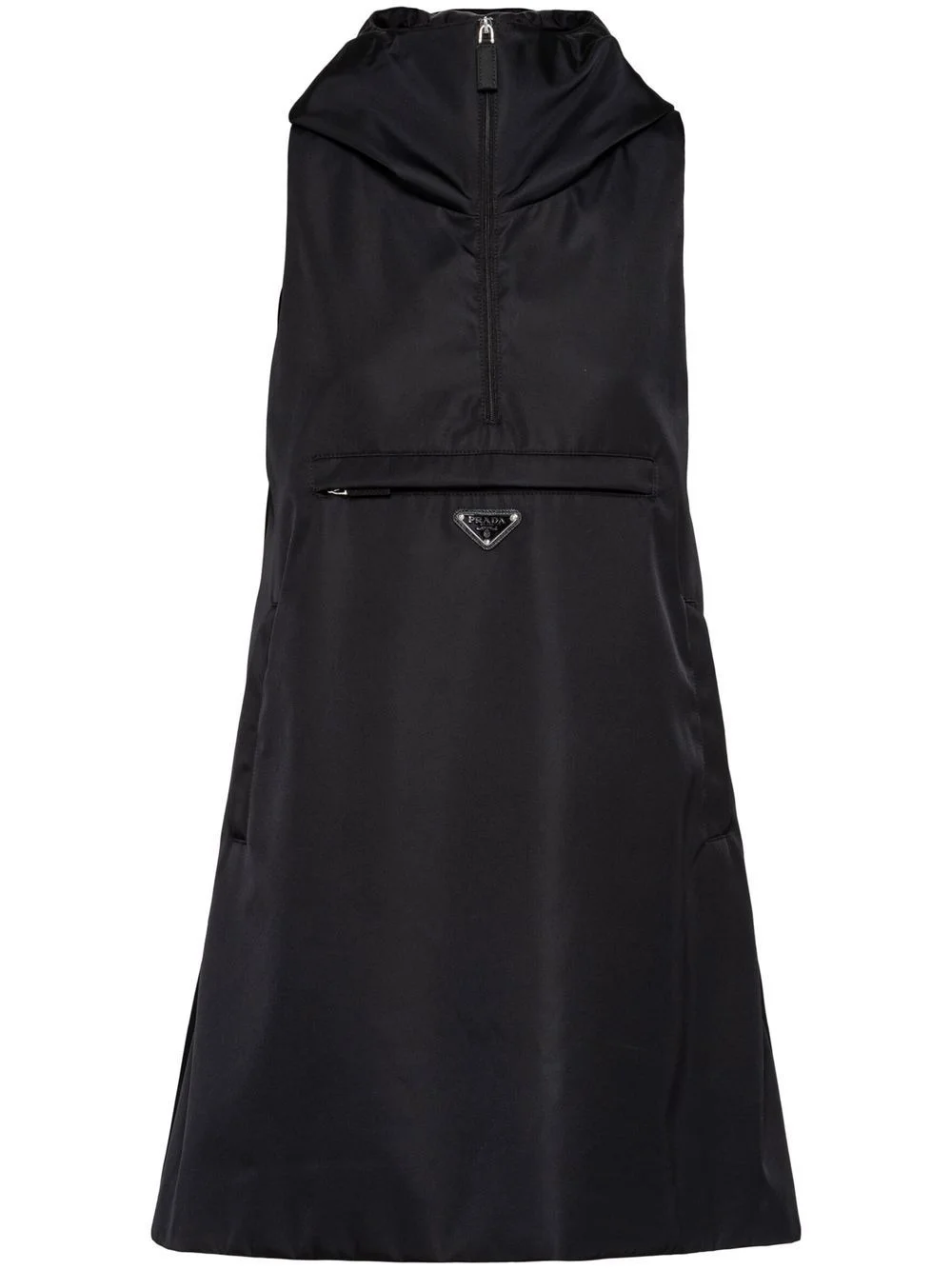 triangle logo hooded minidress Prada’s iconic triangle logo takes centre place on this minidress for a distinct branded touch. The piece is presented in a sleek black hue and features a drawstring hood that combines with the recycled polyamide construction for a utilitarian aesthetic. Highlights - Black - Recycled polyamide - Enamel triangle logo - Front zip-fastening pocket - Drawstring hood - Sleeveless - Thigh-length Composition Outer: Recycled Polyamide 100% Lining: Viscose 100%