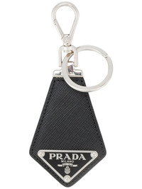 triangle-logo leather keychain Prada's black leather keyring is punctuated with a silver-tone logo plaque, shaped in the house's signature triangle silhouette for a recognisable look. Highlights - What do you mean, your keys aren't as well-dressed as you are? it's okay...don't worry...we can fix this. attach this logo-plaque prada keyring now, and nobody will remember a time before they were at the top of their style game. featuring silver-tone hardware, a front logo plaque, a textured leather detail, a lobster claw fastening and a keyring attachment. Composition Outer: Calf Leather 100%, Metal (Other) 100% SIZE & FIT Measurement WIDTH 1.96 in(5 cm) LENGTH 5.11 in(13 cm)