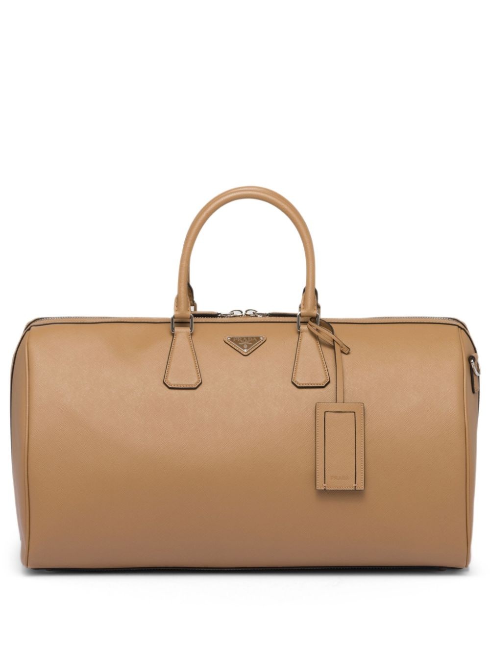 triangle-logo leather bag Prada's bag is minimally decorated with the brand's signature triangle logo at the front and accompanying luggage tag. The gleaming hardware is accented against the background. Highlights - Caramel brown - Saffiano leather - Enamel triangle logo - Front two-way zip fastening - Two rolled top handles - Detachable shoulder strap Composition Outer: Calf Leather 100% SIZE & FIT Measurement DEPTH 9.84 in(25 cm) WIDTH 19.68 in(50 cm) HEIGHT 10.82 in(27.5 cm)