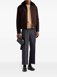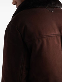 triangle-logo leather bomber jacket Highlights - Brown - Leather - Shearling collar - Front zip fastening - Two side welt pockets - Logo patch to the rear - Enamel triangle logo - Long sleeves - Straight hem Composition Lambskin 100% Washing instructions Specialist Cleaning
