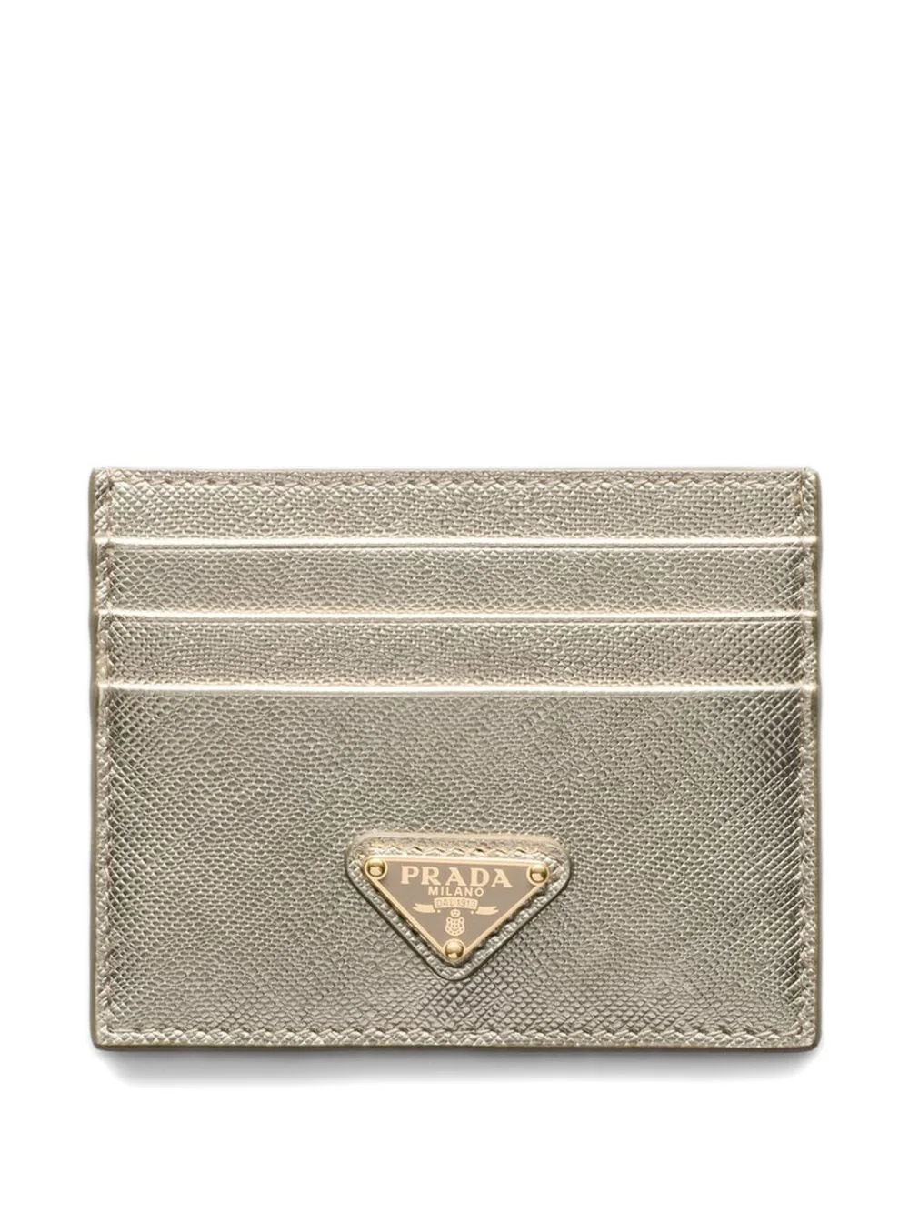 triangle logo leather card holder Highlights - Gold - Textured finish - Enameled metal triangle logo - Six card slots - One inside pocket Composition Saffiano Leather 100%