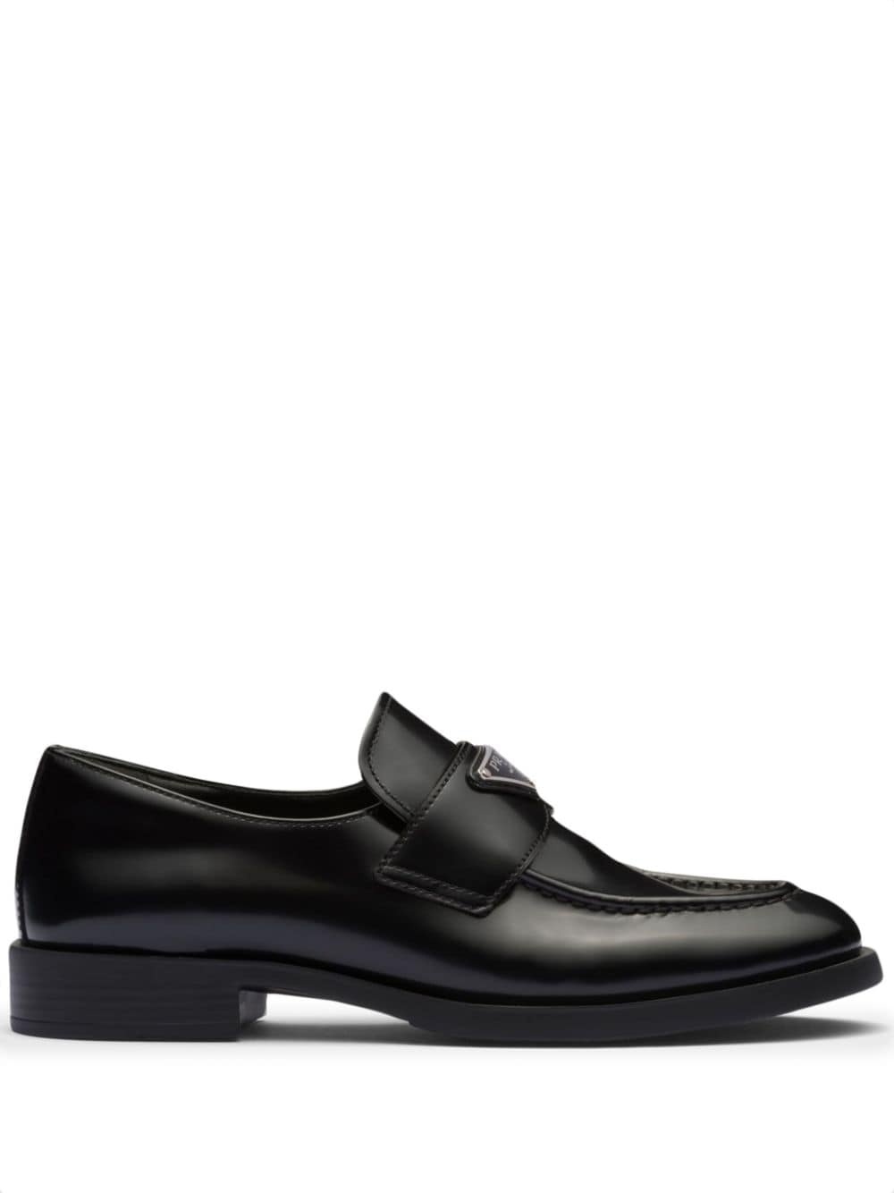 Chocolate leather loafers Highlights - Black - Leather - Brushed finish - Enamel triangle logo - Almond toe - Branded leather insole - Flat leather sole Composition Leather 100% SIZE & FIT Measurement HEEL 0.98 in(2.5 cm)