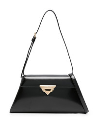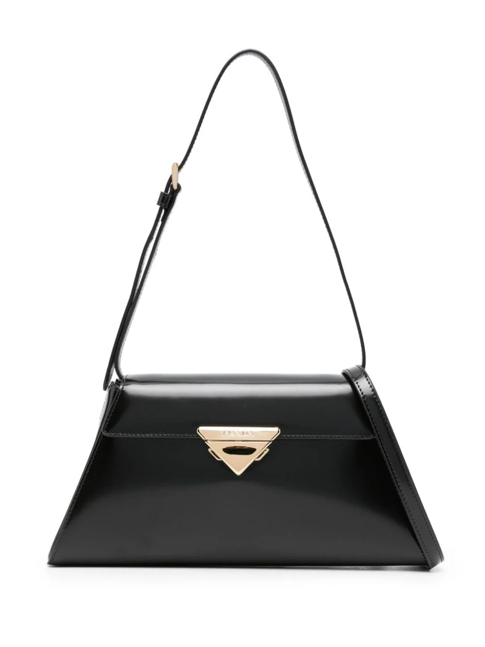 triangle-logo leather shoulder bag Prada's AW23 colection writes the rules for new elegance, as demonstrated by this shoulder bag. Crafted from smooth patent calf leather, the structured trapezoid silhouette nods to retro references, while the triangle logo adds a branded finish. Highlights - Black - Calf leather - Patent finish - Enamel triangle logo - Adjustable top handle - Adjustable detachable shoulder strap - Gold-tone hardware - Foldover top - Push-lock fastening - Internal patch pocket Composition Outer: Calf Leather 100% SIZE & FIT Model measurements Height 5 ft 10 in(1.77 m) Bust/Chest 29.92 in(76 cm) Hips 34.25 in(87 cm) Waist 23.62 in(60 cm) Measurement DEPTH 1.96 in(5 cm) HANDLE 11.02 in(28 cm) HEIGHT 5.11 in(13 cm) STRAP 20.86 in(53 cm) WIDTH 10.62 in(27 cm)