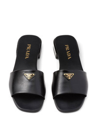 triangle-logo leather slides Highlights - Black - Saffiano leather - Enamel triangle logo - Square open toe - Branded leather footbed - Flat leather sole - Slip-on style Composition Sole: Leather 100% Lining: Leather 100% Outer: Leather 100% SIZE & FIT Measurement HEEL 0.39 in(1 cm)