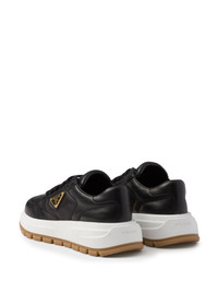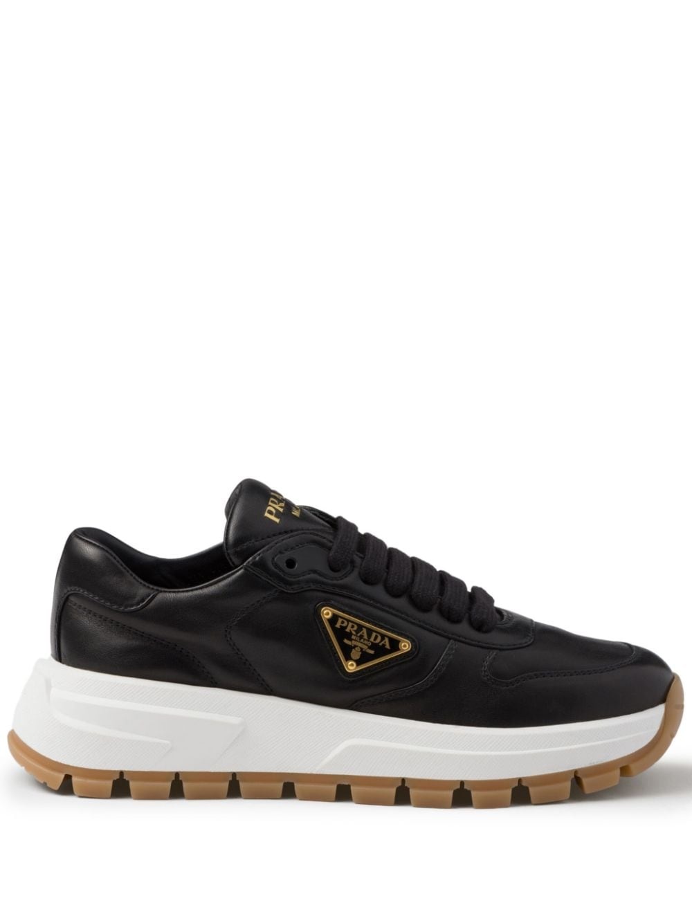 triangle-logo leather sneakers Highlights - Black/white - Leather - Triangle logo - Logo-print tongue - Front lace-up fastening - Round toe - Contrasting rubber sole Composition Leather 100%