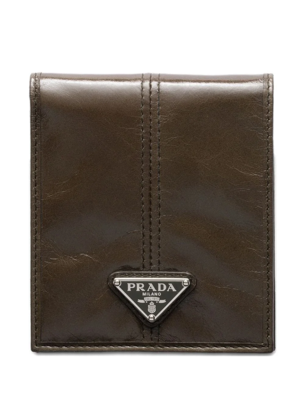 triangle logo leather wallet Highlights - Green - Enameled metal triangle logo - Eight card slots - Two bill compartments - Leather - Moire texture Composition Outer: CALFSKIN 100% Lining: Calf Leather 100% SIZE & FIT Measurement LENGTH 4.33 in(11 cm) WIDTH 3.74 in(9.5 cm)