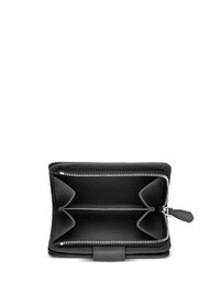 triangle-logo leather wallet Highlights - Black - Saffiano leather - Textured finish - Triangle logo - Silver-tone hardware - Bi-fold design - Top zip fastening - Concealed press-stud fastening - Internal logo stamp - Internal card slots - Coin pocket Composition Outer: Calf Leather 100% SIZE & FIT Measurement LENGTH 4.72 in(12 cm) WIDTH 3.14 in(8 cm)