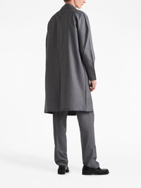 triangle-logo mohair-wool trousers Made from mohair, these tailored trousers by Prada spotlight the brand's sophisticated style. Featuring a soft melange effect, they are cut to a slim fit and boast a tonal triangle logo for an instantly recognisable look. Highlights - Grey - Mohair - Melange effect - Mid-rise - Concealed front fastening - Belt loops - Two side slit pockets - Rear welt pocket - Triangle logo - Tailored cut Composition Mohair 100% SIZE & FIT FittingInformation Designed for a slim fit, offering a comfortable fit that sits just away from the leg Adjust this piece’s waistband to your preference using the drawstring Made from a lightweight non-stretch fabric