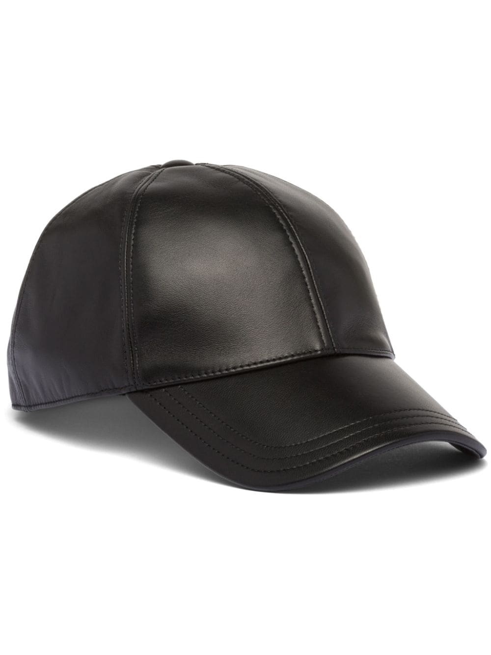 triangle-logo leather baseball cap Prada uses its refined Italian eye for style to elevate the sporty nature of this black baseball cap. A smooth leather construction combines with a tonal enamelled triangle logo plaque at the back. Highlights - Black - Nappa leather - Enamel triangle logo - Six-panel construction - Curved peak - Rear touch-strap fastening - Pull-on style Composition Nappa Leather 100% Washing instructions Read Manufacturer Guidelines