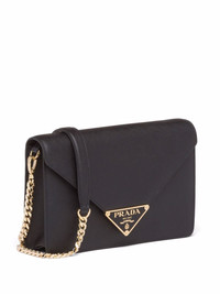 triangle logo-plaque crossbody bag Constructed in black Saffiano leather, Prada's crossbody bag is detailed with the brand's signature enamel triangle logo plaque. In an envelope silhouette, it features complimentary gold-tone hardware and a spacious main compartment. Composition Outer: Leather 100% SIZE & FIT Measurement STRAP 43.3 in(110 cm) DEPTH 1.57 in(4 cm) WIDTH 8.46 in(21.5 cm) HEIGHT 5.51 in(14 cm)