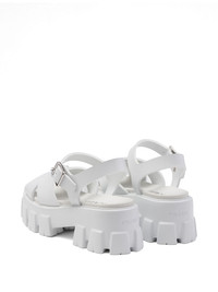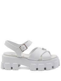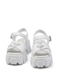 triangle-logo platform sandals Highlights - White - Caged design - Enamel triangle logo - Buckle-fastening ankle strap - Round open toe - Silver-tone hardware - Branded footbed - Platform sole Composition Sole: Rubber 100% Outer: Rubber 100% Lining: Leather 100%