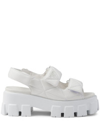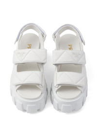Monolith quilted leather sandals Fashioned from nappa leather, these sandals are elevated by geometric quilting that echoes Prada's iconic triangle logo. The touch-strap fastening imparts a casual feel to the design, while tonal logo lettering provides the ultimate branding accent. Highlights - White - Nappa leather - Quilted - Triangle logo - Branded insole - Ankle touch-strap fastening - Chunky rubber sole Composition Leather 100% SIZE & FIT Measurement HEEL 2.16 in(5.5 cm) PLATFORM 2.16 in(5.5 cm)