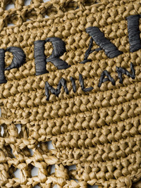 triangle-logo raffia tote bag Prada puts its contemporary spin on the classic top handle tote bag. Intricately woven to highlight the triangle shape synonymous with the fashion house, this is a simple bag that has been crafted with intent. Highlights - Green - Raffia - Triangle logo - Open top - Two top handles - Main compartment Composition Raffia 100% Outer: Raffia 100% SIZE & FIT Measurement DEPTH 1.18 in(3 cm) HANDLE 7.48 in(19 cm) HEIGHT 14.17 in(36 cm) WIDTH 14.17 in(36 cm)