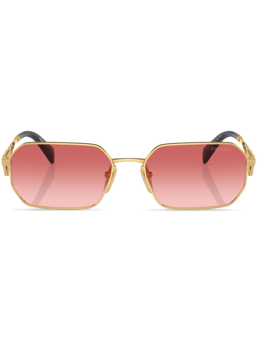 triangle-logo rectangular sunglasses First used by founder Mario Prada in 1913 as a 'mark of quality and craft', Prada's triangle logo is a house code intrinsically associated with its heritage and identity. It is featured in these rectangular sunglasses, encased in their gold-tone metal arms. Highlights - Gold-tone - Metal - Enamel triangle logo - Rectangle frame - Pink tinted lenses - Nose pads - Sculpted arms - Curved tips - These glasses come with a protective case. Composition Metal 100%