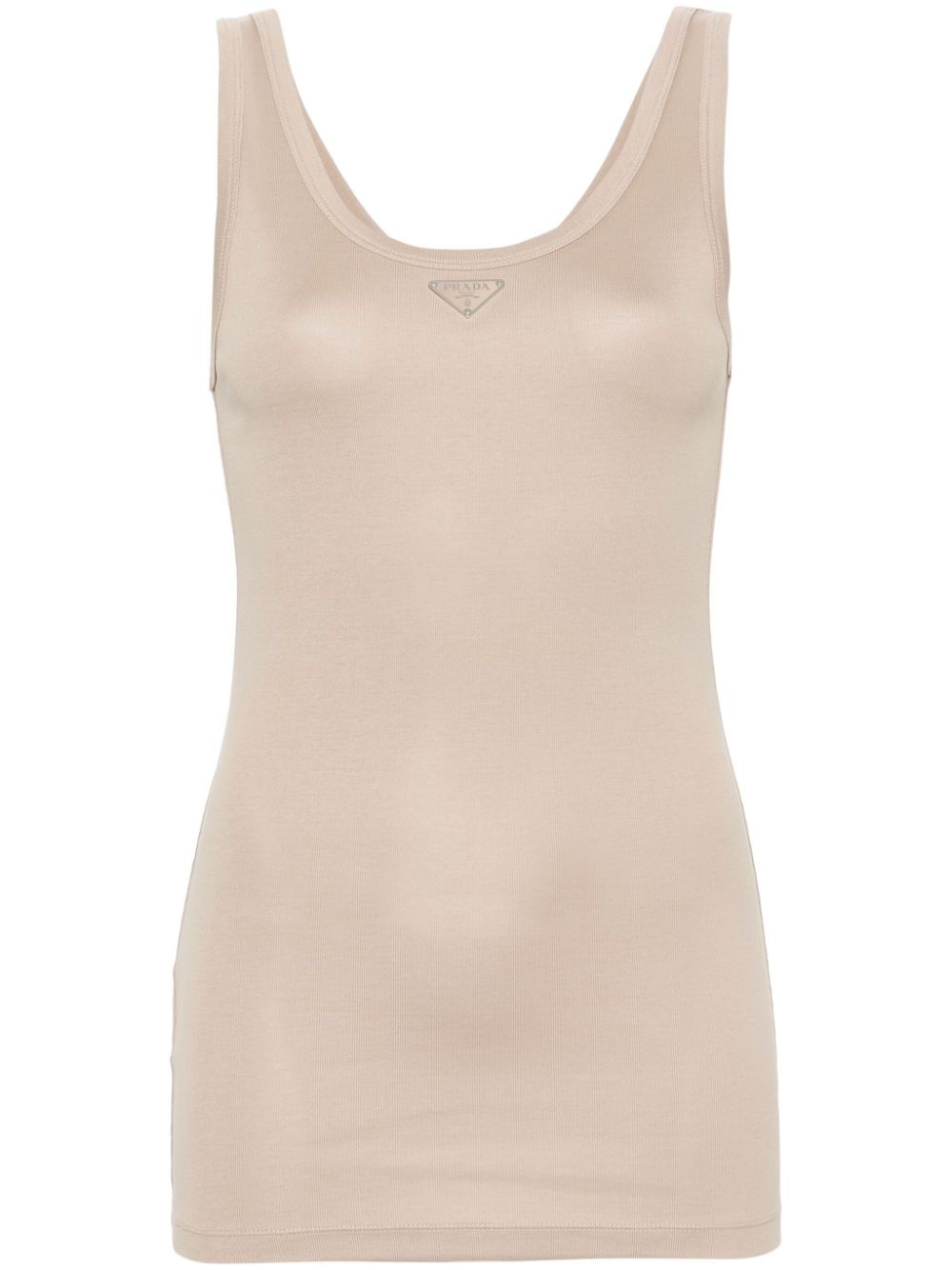 triangle-logo ribbed tank top Highlights - Beige - Cotton - Ribbed knit - Enamel triangle logo - Scoop neck - Sleeveless - Straight hem Composition Cotton 100% SIZE & FIT Model measurements Height 5 ft 10 in(1.78 m) Bust/Chest 31.49 in(80 cm) Hips 37 in(94 cm) Waist 23.62 in(60 cm) FittingInformation Designed for a close fit throughout Made from a midweight non-stretch fabric, this piece offers minimal elasticity when worn This piece fits true to size – take your usual size