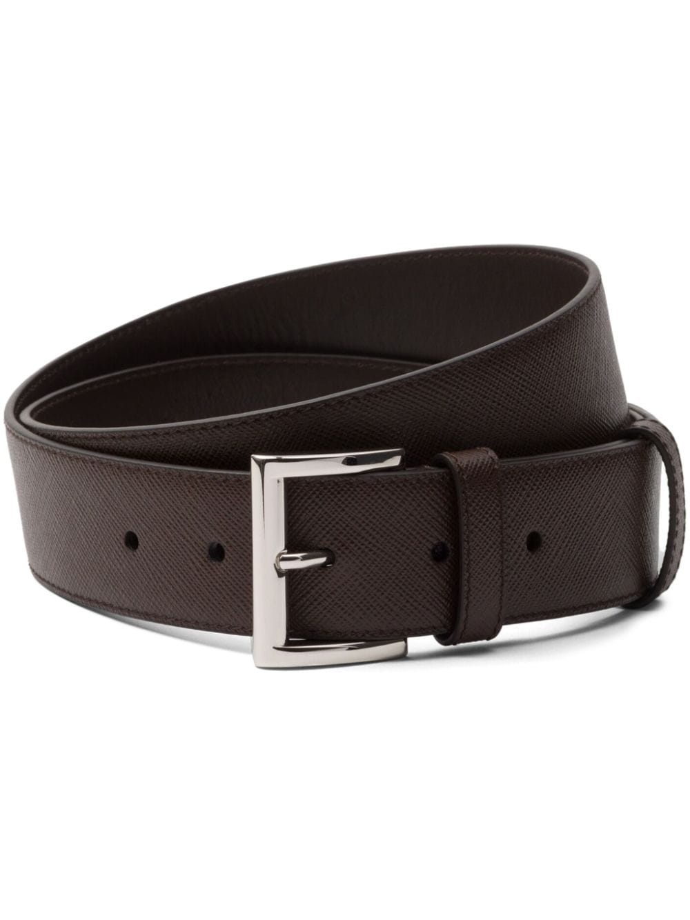triangle-logo Saffiano leather belt Highlights - Cedar brown - Saffiano leather - Buckle fastening - Enamel triangle logo - Punched holes - Adjustable fit Composition Leather 100% SIZE & FIT Measurement WIDTH 1.57 in(4 cm) Maximum Length 35.43 in(90 cm) Minimum Length 31.49 in(80 cm)