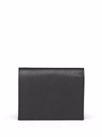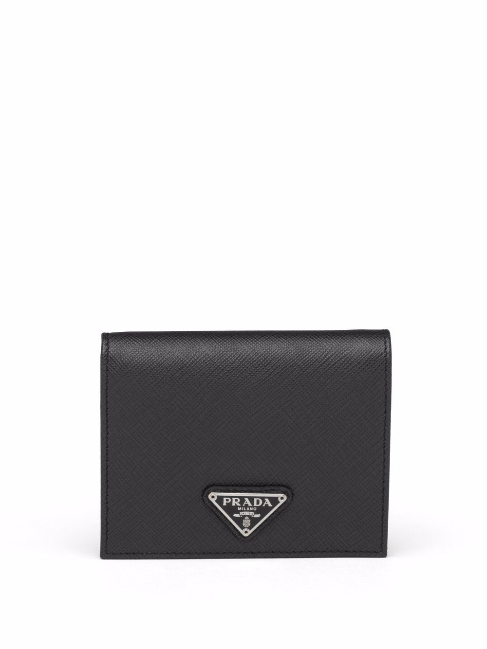 triangle-logo saffiano leather wallet First introduced as a housecode in 1913, Prada's iconic enamel triangle logo now adorns the House's accessories in contemporary reinterpretations. It can be seen in a tonal design with a silver-toned trim on the front of this compact wallet, crafted in saffiano leather with multiple practical internal pockets. Highlights - Black - Leather - Saffiano leather - Enamel triangle logo - Foldover top with press-stud fastening - Note compartment - Internal card slots - Internal flap pocket Composition Outer: Leather 100% Lining: Leather 100% SIZE & FIT Measurement LENGTH 4.4 in(11.2 cm) WIDTH 3.34 in(8.5 cm)