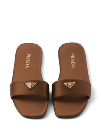 triangle-logo satin slides Highlights - Tobacco brown - Satin finish - Enamel triangle logo - Square open toe - Single toe strap - Open back - Branded footbed - Flat leather and rubber sole - Slip-on style Composition Outer: Satin 100% Sole: Calf Leather 100% Lining: Fabric 100% SIZE & FIT Measurement HEEL 0.39 in(1 cm) Sole height 0.39 in(1 cm)