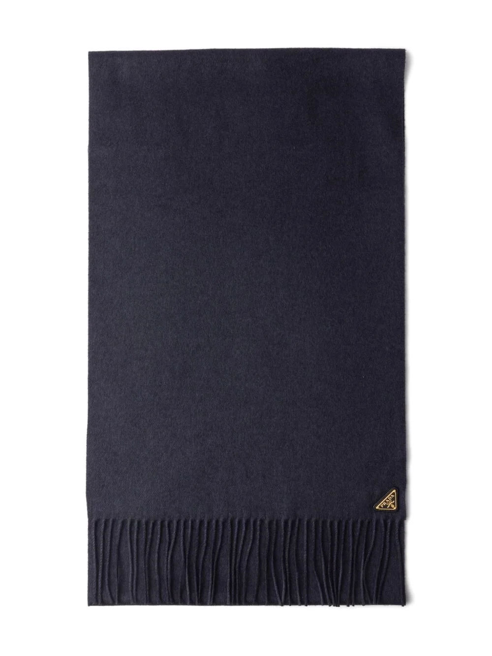 triangle-logo scarf Highlights - Navy blue - Silk-cashmere blend - Enamel triangle logo - Fringe detail Composition Silk 51%, Cashmere 49% SIZE & FIT Measurement LENGTH 66.92 in(170 cm) WIDTH 13.77 in(35 cm) Washing instructions Read Manufacturer Guidelines