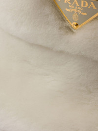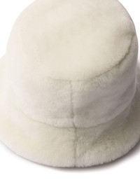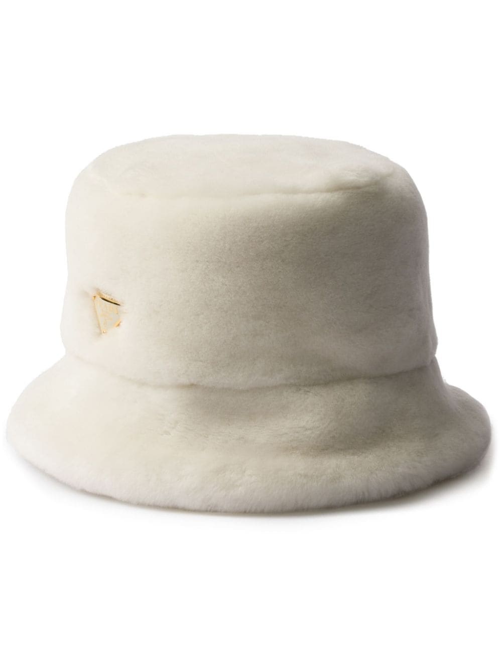 triangle-logo shearling bucket hat Highlights - Ivory white - Shearling - Brushed effect - Enamel triangle logo - Dropped narrow brim - Bucket body - Flat crown - Pull-on style Composition Sheep Skin/Shearling 100%, Enamel 100%