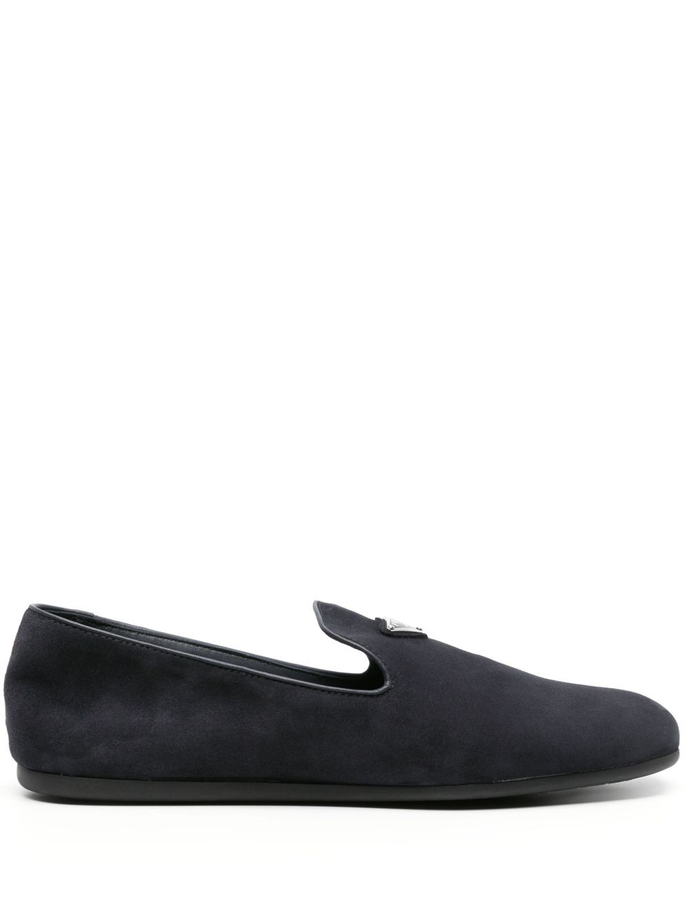 triangle-logo suede loafers Highlights - Midnight blue - Calf suede - Enamel triangle logo - Square toe - Leather trim - Branded leather insole - Flat rubber sole - Slip-on style Composition Sole: Rubber 100% Lining: Calf Leather 100% Outer: Calf Suede 100%