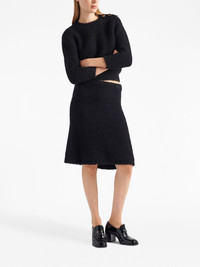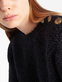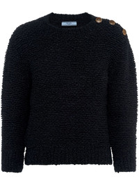 triangle-logo boucle jumper Crafted from a soft virgin-wool blend, this textured jumper by Prada is rendered in black, leaning into the brand's familiar minimalistic style. Gold-tone logo embossed buttons adorn the shoulder to one side, whilst the brand's iconic triangle logo decorates the rear in a tonal hue. Highlights - Black - Virgin wool blend - Round neck - Logo-embossed buttons - Three-quarter length sleeves - Triangle logo - Straight hem Composition Mohair 100% Washing instructions Read Manufacturer Guidelines