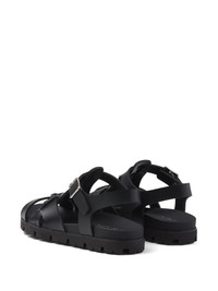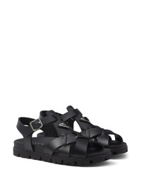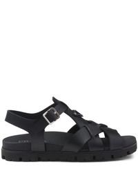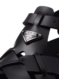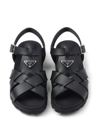 triangle-logo woven sandals Highlights - Black - Leather - Enamel triangle logo - Interwoven design - Buckle-fastening ankle strap - Open toe - Flat rubber sole Composition Sole: Rubber 100% Outer: Rubber 100% Lining: Leather 100%