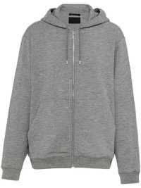 triangle-logo zip-up hoodie Prada combines a refined cashmere and silk construction with streetwear inspiration in this hoodie. Cut to a relaxed silhouette, it's subtly embellished with a distressed triangle logo at the back. Highlights - Grey - Cashmere-silk blend - Fine knit - Triangle logo - Drawstring hood - Front zip fastening - Long sleeves - Two front pouch pockets - Ribbed cuffs and hem - Straight hem Composition Cashmere 96%, Silk 4%