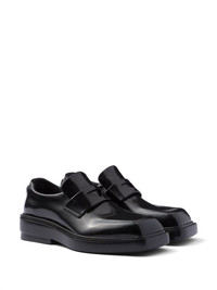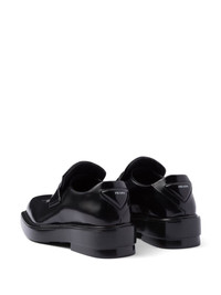 triangle-patch leather loafers Prada pairs Italian leather craftsmanship with its timeless sleekness in these black leather loafers. Adorned with the signature triangle logo patch, contrast white logo lettering appears at the heel counter for a branding-focused finish. Highlights - Black - Leather - Smoothing finish - Triangle logo - Square toe - Logo print to the rear - Branded leather insole - Leather sole - Slip-on style Composition Outer: Leather 100% Lining: Leather 100% Sole: Leather 100% SIZE & FIT Measurement HEEL 1.57 in(4 cm)