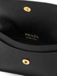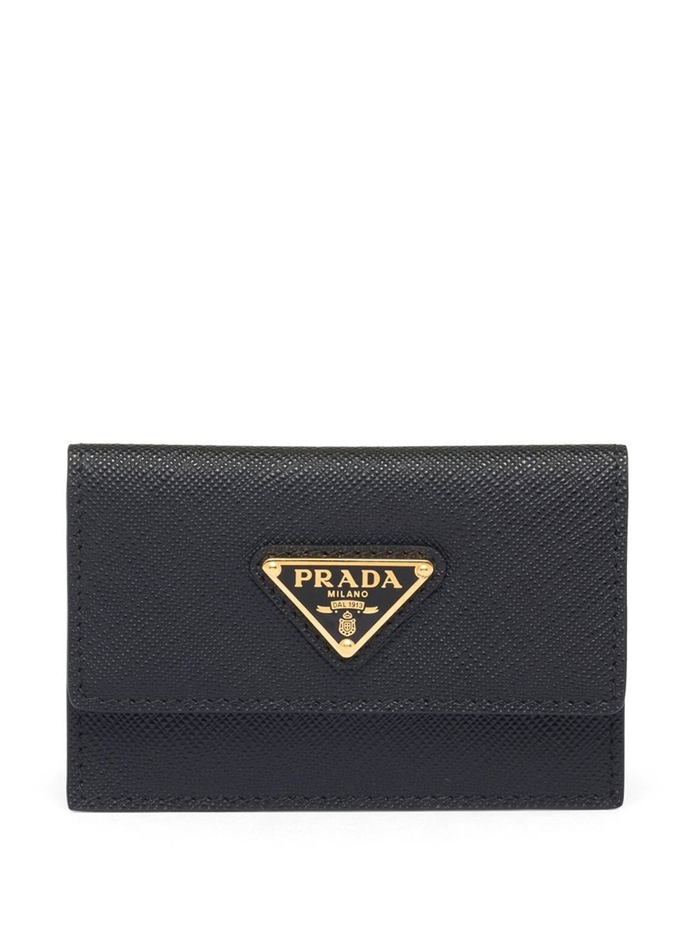 triangle-plaque cardholder black calf leather enamel triangle logo foldover top with press-stud fastening internal logo stamp internal card slots Composition Calf Leather 100% SIZE & FIT Measurement HEIGHT 2.75 in(7 cm) WIDTH 3.93 in(10 cm)