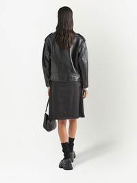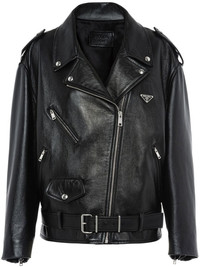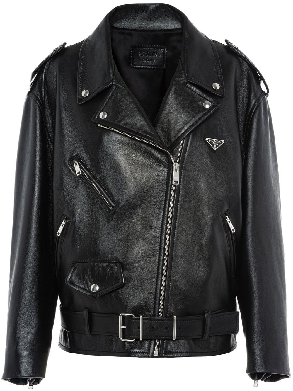 triangle-plaque leather jacket Prada's triangular logo plaque is an iconic motif for the brand that transcends seasons and trends thanks to its traditional shape and refined lettering. Finding a home on the chest of this lambskin jacket, the black-hued design evokes casual refinery at its best. Composition Lambskin 100%