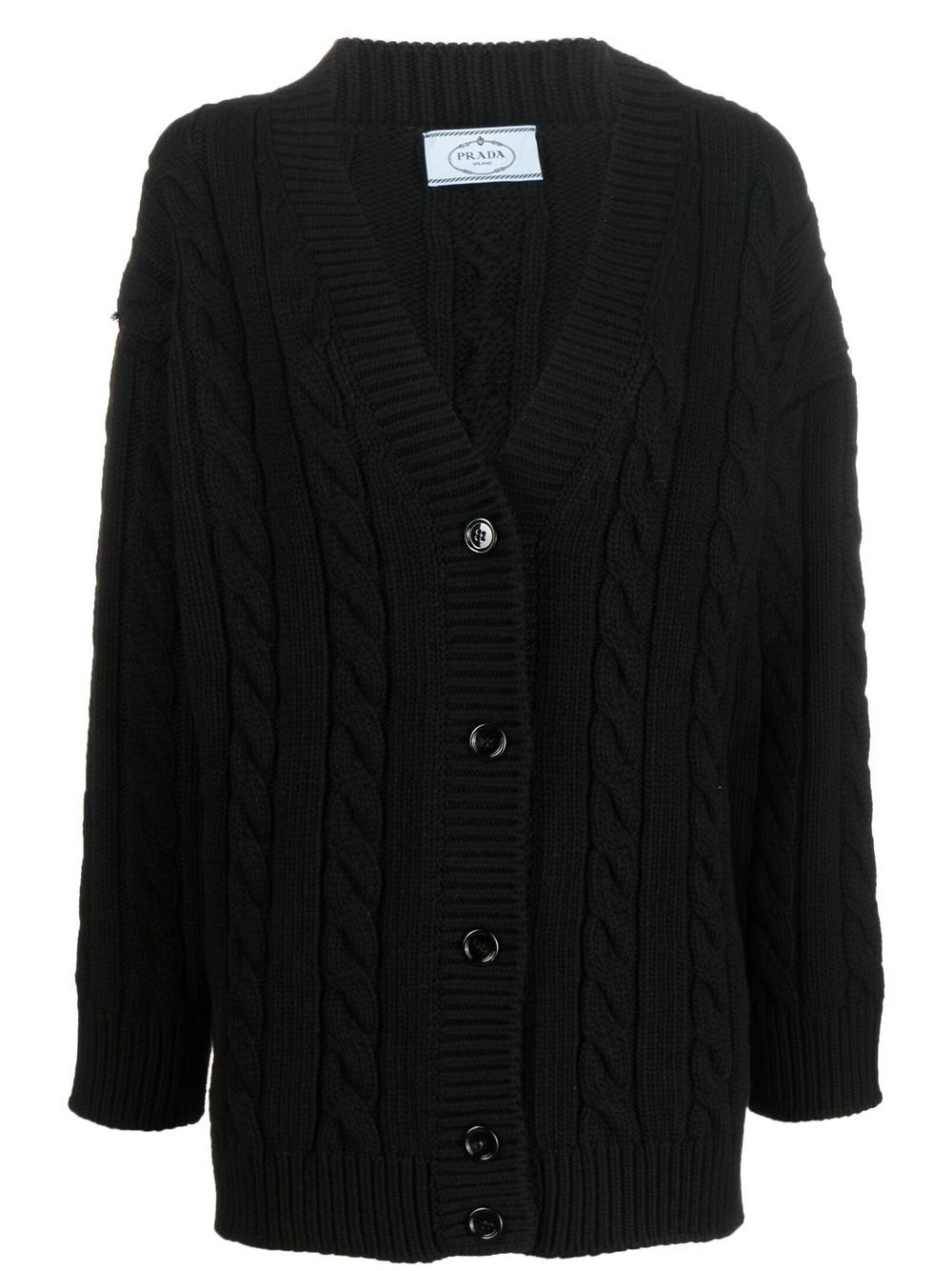 V-neck cable-knit cardigan Made from a blend of virgin wool and cashmere, this cardigan from Prada is defined by its textured cable-knit construction. It is designed with drop shoulders for a relaxed feel. Composition Virgin Wool 70%, Cashmere 30% SIZE & FIT Model measurements Height 5 ft 11 in(1.8 m) Bust/Chest 31.49 in(80 cm) Hips 35.43 in(90 cm) Waist 24.4 in(62 cm) FittingInformation This piece fits true to size. We recommend you get your regular size Cut for a loose fit Made with a mid-weight fabric