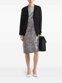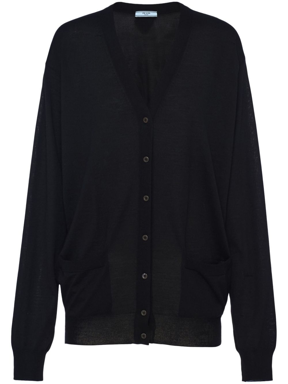 V-neck cashmere cardigan Prada presents a wardrobe staple in this v-neck cardigan, evident through its premium cashmere construction and all-black colour palette. Highlights - Black - Cashmere - V-neck - Front button fastening - Long raglan sleeves - Straight hem - Ribbed trim Composition Cashmere 100%