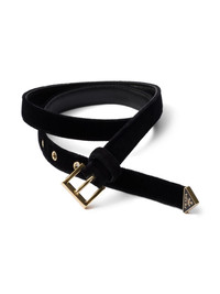 velvet belt Highlights - Black - Velvet - Calf leather - Buckle fastening - Punched holes - Adjustable fit - Enamel triangle logo Composition Velvet 100%, Metal 100%, Calf Leather 100%