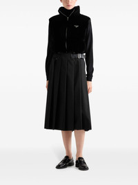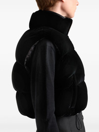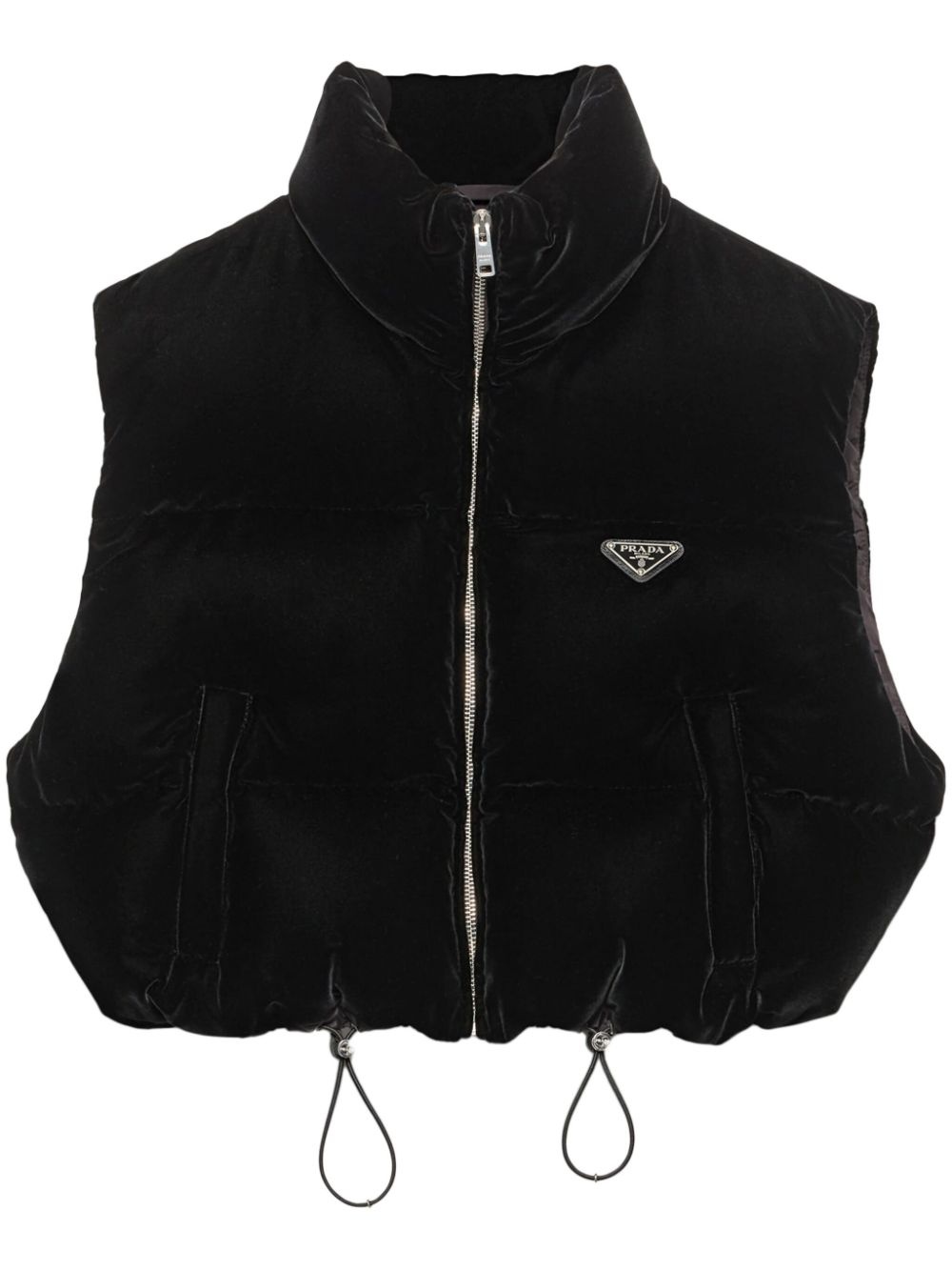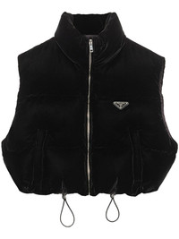 Velvet down vest Highlights - Black - Velvet - Padded design - Down-feather filling - Quilted - Enamel triangle silver-tone logo plaque - Funnel neck - Front zip fastening - Sleeveless - Full lining - Drawstring hem - Cropped Composition Outer: Viscose 65%, Cupro 35% Lining: Recycled Polyamide 100%, Goose Down 90%, Goose Feather 10%