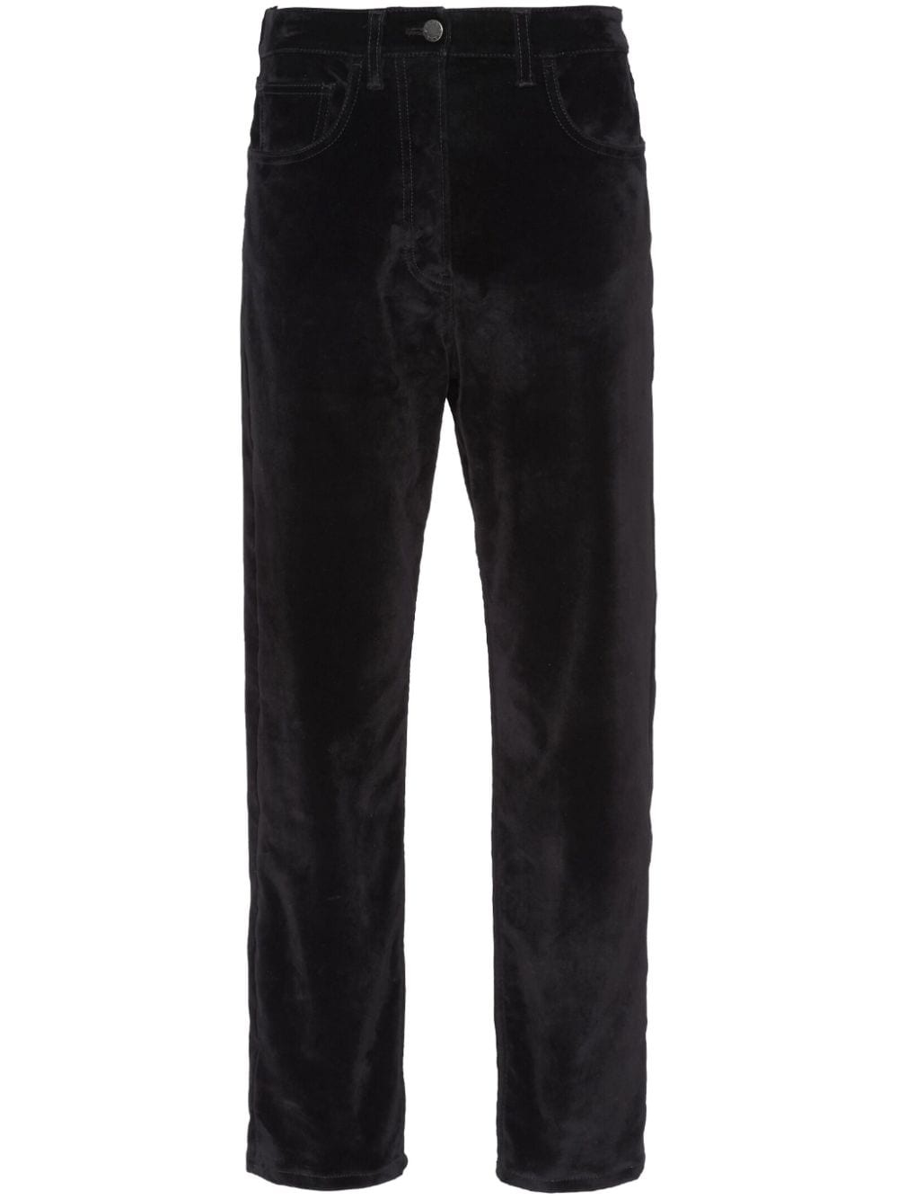 mid-rise velvet jeans Prada reimagines the classic straight-leg jeans by giving them a distinctive velvet finish. This black-hued pair is complete with the emblematic archive logo on the rear. Highlights - Black - Cotton - Denim - Velvet effect - Enamel triangle logo - Mid-rise - Belt loops - Button fly fastening - Classic five pockets - Straight leg Composition Cotton 100%